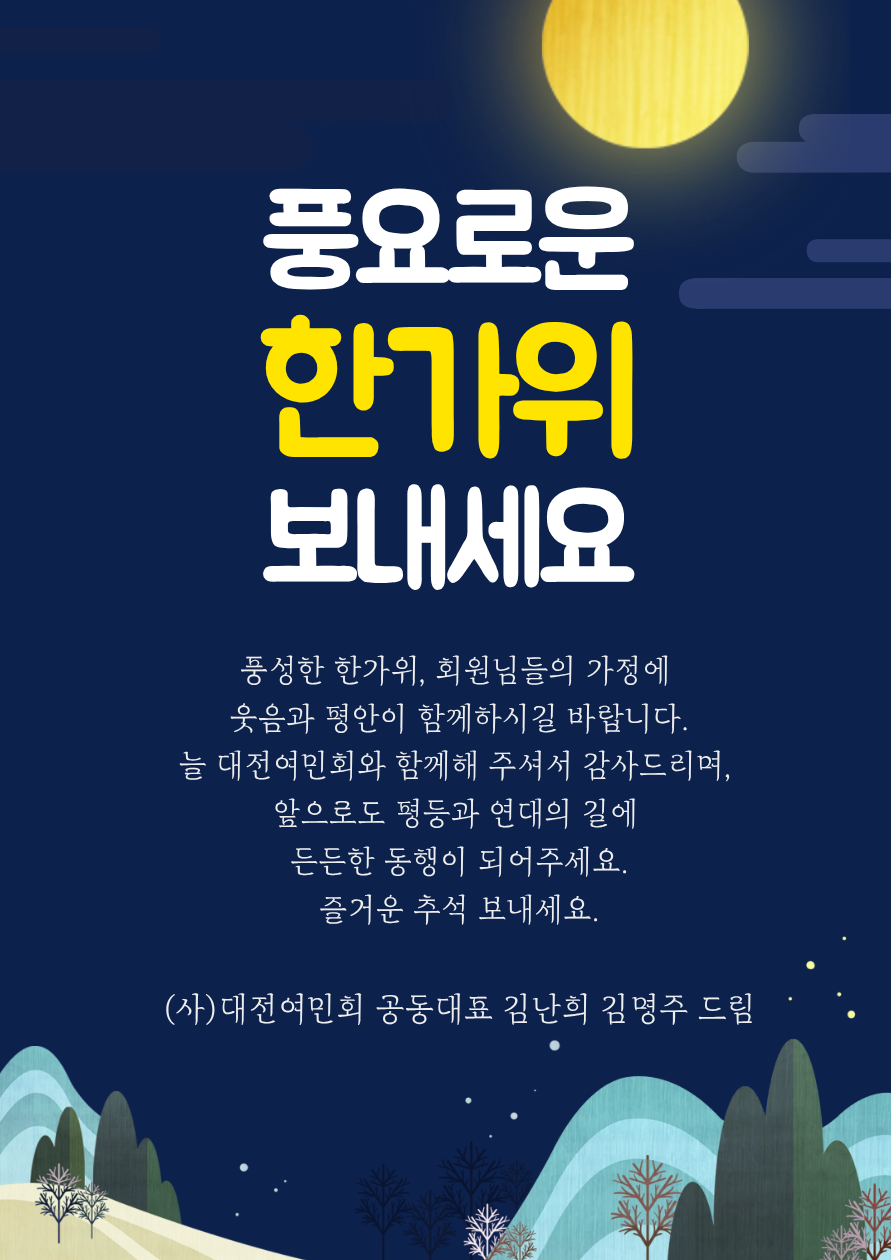 풍요로운 한가위 보내세요! 페이지 정보 작성자 대전여민회 댓글 0건 조회 54회 작성일 25-10-02 09:44 본문 풍요로운 한가위 보내세요!! (사) 대전여민회 공동대표 김난희, 김명주 드림 목록 다음글대전여민회 후원의 밤에 초대합니다 25.09.24