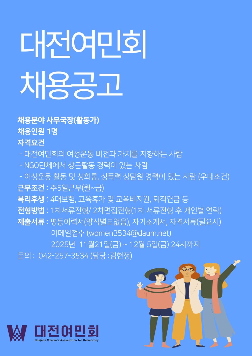 대젼여민회 채용공고 페이지 정보 작성자 대전여민회 댓글 0건 조회 27회 작성일 25-11-21 11:23 본문 대전여민회 채용공고 많은분들의 지원과 관심 부탁드립니다 목록 다음글여진 9호 발행되었습니다.! 25.10.17