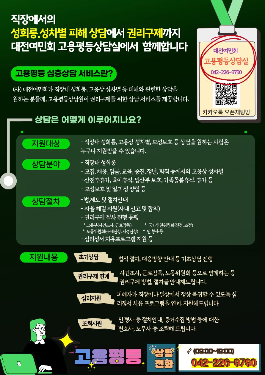 대전여민회 고용평등상담실이 다시 시민들과 함께합니다. 페이지 정보 작성자 대전여민회 댓글 0건 조회 7회 작성일 26-03-09 16:57 본문 목록 다음글대전여민회 웹진 "여진 11호 " 발행되었습니다 26.02.20
